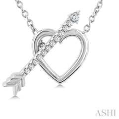 A graceful fusion of love and direction, this diamond fashion toggle necklace symbolizes the heart's journey guided by purpose and affection. It features a sleek open window heart pendant interlocked by an arrow-shaped toggle clasp, a nod to Cupid's arrow and the timeless power of love. The heart is sculpted in plain gold, while the arrow toggle sparkles with 12 prong set round cut diamonds along the shaft and arrowhead, leaving the plain gold fletches untouched for contrast. An Cable Chain 0.85 MM in 18 Inches with Spring Lock & Extenders at 16 & 17 completes the necklace, all molded in rhodium finish 10 karat white gold. Total diamond weight is 1/8 ctw.