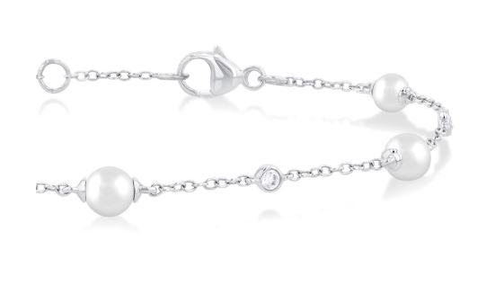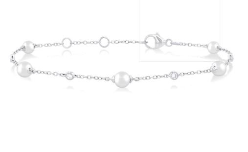 14KW .07CTW BEZEL SET ROUND BRILLIANT DIAMOND AND 4MM PEARLS ALTERNATING BRACELET 6.5"-7.25"