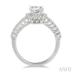 A scintillating diamond engagement ring for the special lady in your life. Featuring a large 3/4 Ct prong set princess cut center stone diamond. Sparkling 28 round cut diamonds bounds the center in a square motif and flow down the shank in a brilliant row. Diamonds are beautifully pave set in luminous 14 karat white gold. Total diamond weight is 1 1/4 Ctw.